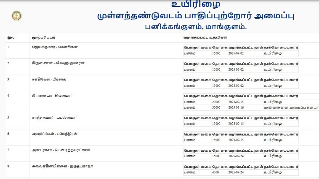 எமது உயிரிழை அமைப்பினால் மாதாந்தம் மருத்துவ ரீதியான இடங்களால் அவதிப்படும் பயனாளிகளுக்கான மருத்துவ கொடுப்பனவுகள் வழங்கப்பட்டு வருகின்றது. அந்த வகையில் 2025 செப்டம்பர் மாதத்தில் 8 பயனாளிகளுக்கு மருத்துவ கொடுப்பனவு வழங்கப்பட்டது. இவ் உதவியை மண்வாசனை அமைப்பினர் இணைந்து மேற்கொண்டமை குறிப்பிடத்தக்கது.